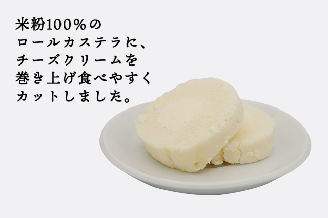 米粉100%のロールカステラに、チーズクリームを巻き上げ食べやすくカットしました。
