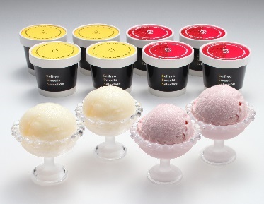 新潟県産のル レクチエピューレを使用した洋梨特有の舌触りと香りが豊かなシャーベット、新潟県産のいちごを使用し、練乳を加えたいちごの甘さ、コク、香りが引き立つアイスクリームの2種セットです。